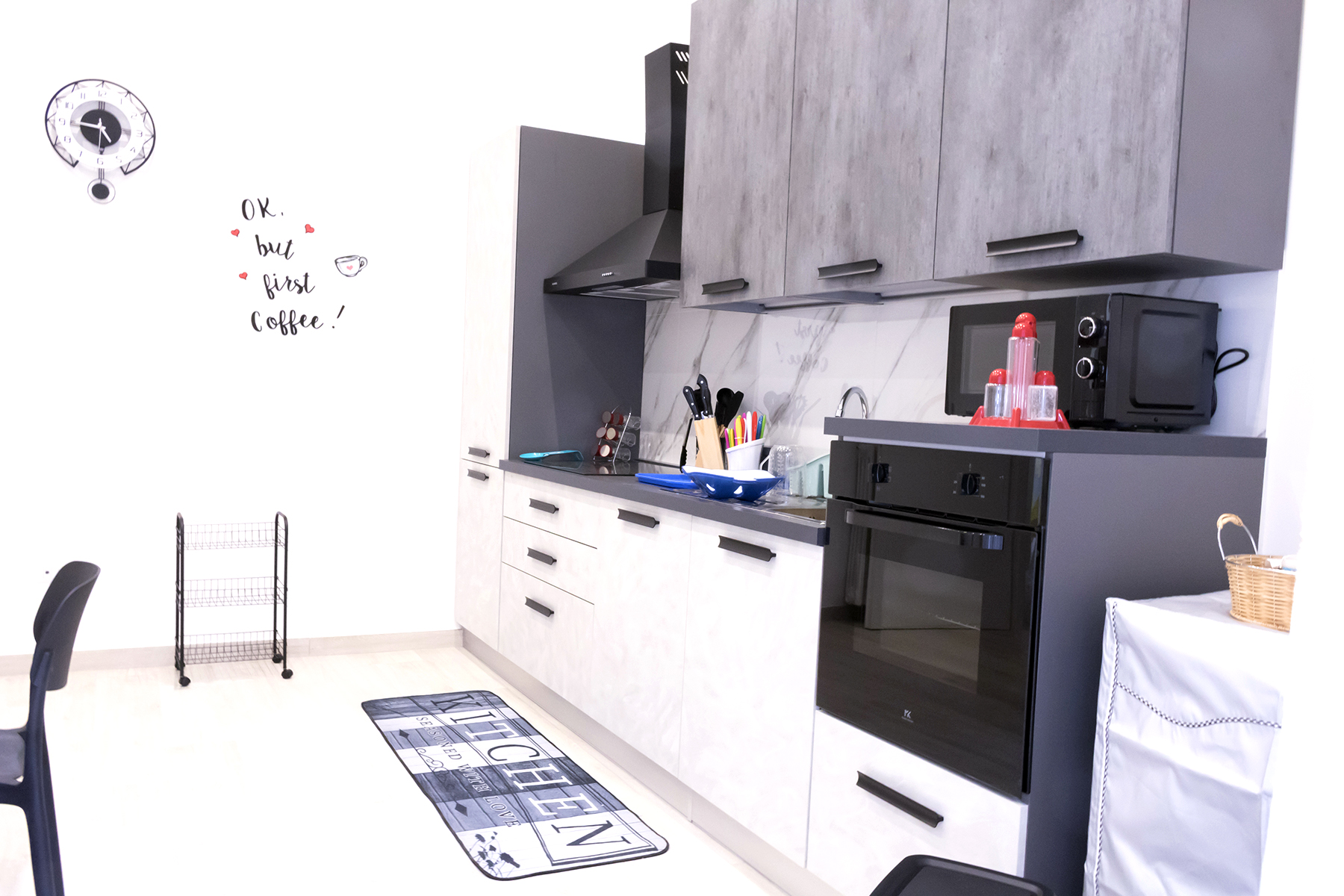 Cucina ad induzione, con forno e fornetto a microonde, macchina del caffè a cialde, posate e stoviglie.
